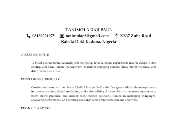 Hi, I’m Tanimola Raji Paul — a creative graphic designer specializing in brand identity, social media visuals, and print design. I bring your ideas to life with clarity, creativity, and purpose.